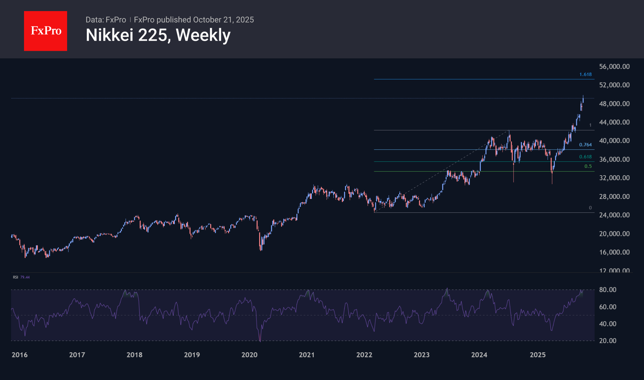 На недельных таймфреймах Nikkei225 близок, но ещё не вошёл в зону перекупленности по RSI. В последние 10 лет мощные коррекции после ралли были при индексе вблизи 80, а сейчас он у 75. В целом это довольно высокие значения, но нередко в подобных случаях ралли становится экстремальным, выбивая позиции ранних продавцов. Не стоит удивляться росту индекса вплоть до 52–53 тысяч, что ближе к типичному размаху ралли Японии последних лет и соответствует уровню 161.8% от полуторалетнего взлёта по середину 2024 года.