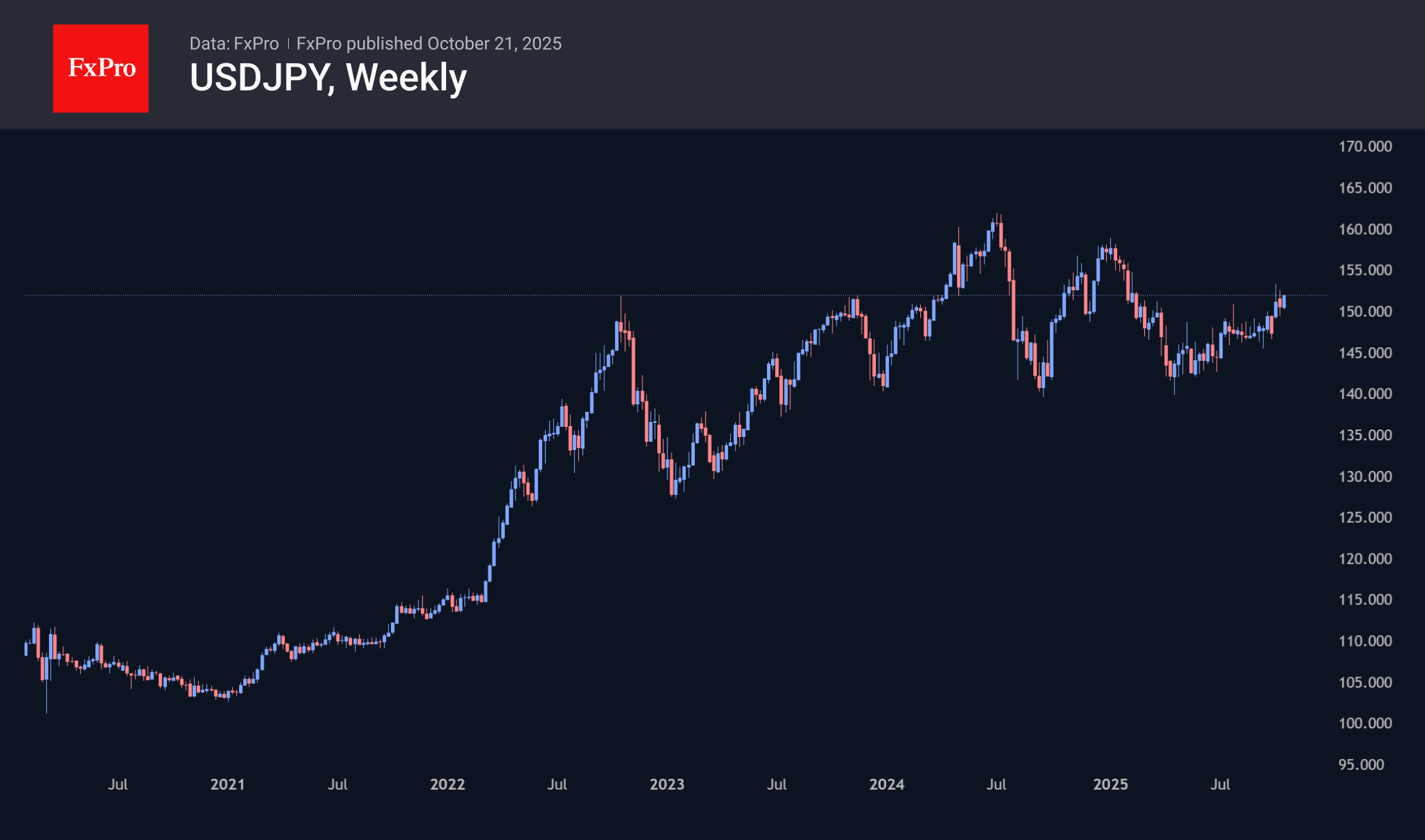 События октября ускорили тренд роста USDJPY, который может достичь своей кульминации в области 158–160. У этих уровней рынок разворачивался в июле 2024 и январе 2025 не без помощи Банка Японии. Вместе с тем есть небольшой шанс, что USDPY прорвёт эту зону сопротивления, учитывая изменившийся политический ландшафт. В этом случае технической целью будет область 200 иен за доллар – логичное развитие импульса роста 2021–2024 годов.