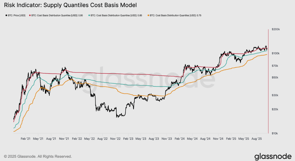 Прогноз Хоугана совпадает с тем, что цена биткоина остается в диапазоне квантилей базовой стоимости 0,85-0,95 ($108 400 до $117 100). Ведущая криптовалюта рискует более глубоким откатом, если цены не смогут вернуться выше $117 100, согласно аналитикам Glassnode в отчете в среду отчете.