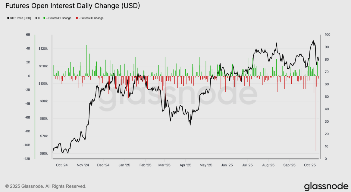 Тем временем, спотовая торговая активность резко возросла во время недавнего потрясения, достигнув самых высоких уровней в 2025 году. С другой стороны, открытый интерес по фьючерсам на биткоин зафиксировал одно из крупнейших однодневных падений за всю историю, уничтожив более $10 миллиардов в кредитных позициях.