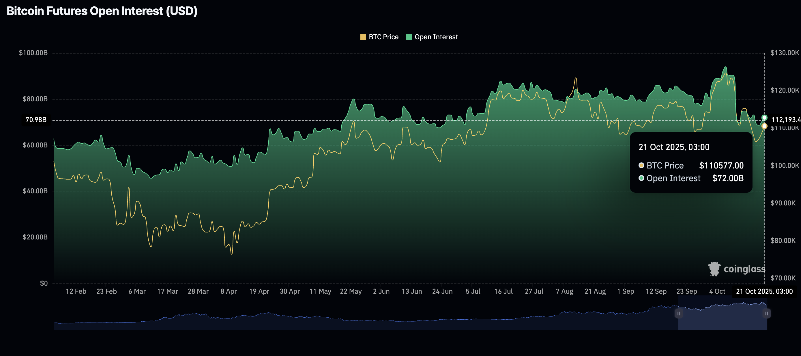 Открытый интерес по фьючерсам на биткоин (OI) снизился примерно на 23% до $72 миллиардов во вторник после достижения исторического максимума в $94,12 миллиарда 7 октября, согласно данным CoinGlass.