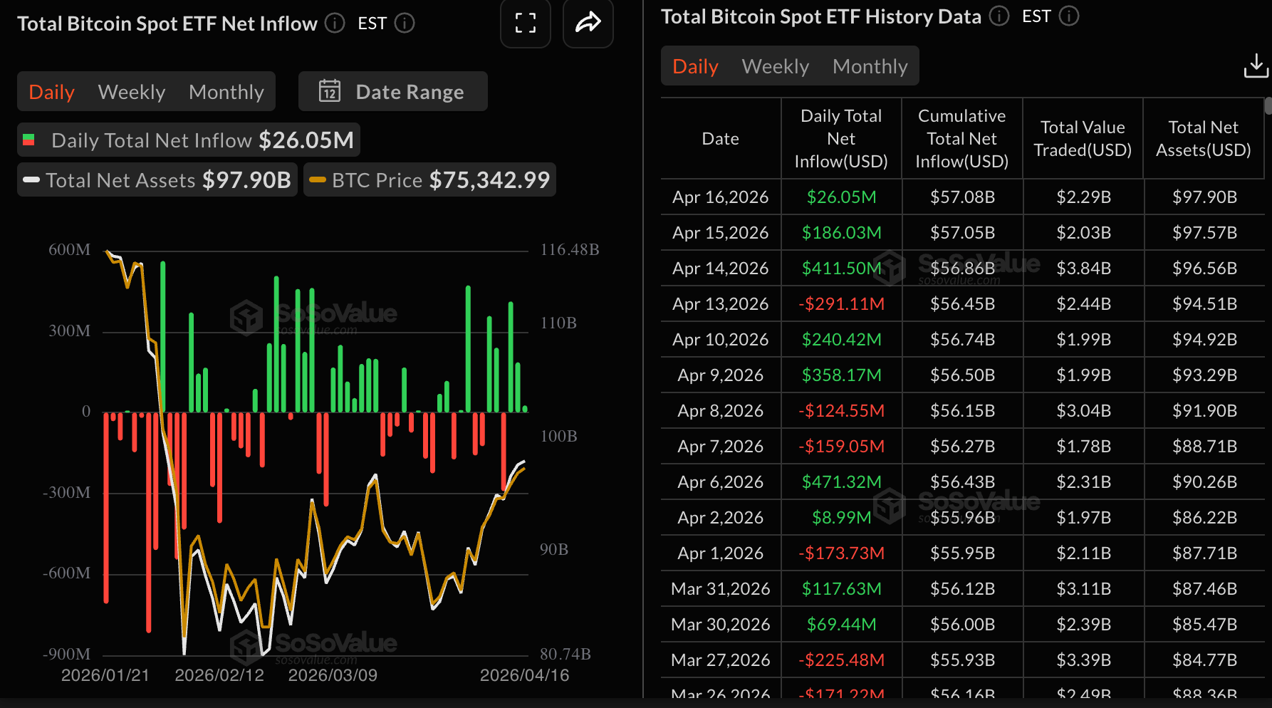Возвращение институциональных инвесторов на рынок подтверждается стабильными притоками в спотовые ETF на биткоин, поскольку BTC набирает импульс выше $75 000. ETF, зарегистрированные в США, привлекли около $26 млн притоков в четверг, что совпало с ростом цены с недельного открытия на уровне $70 742.