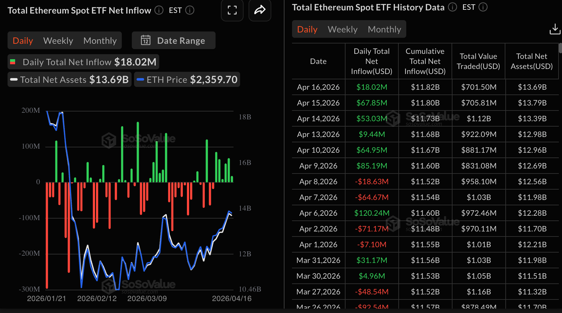Ethereum также зафиксировал притоки примерно в $18 млн в четверг, продлевая бычью серию шестой день подряд. Возобновившийся интерес инвесторов к риску способствовал накоплению совокупных притоков в спотовые ETH-ETF до среднего уровня $11,82 млрд, а активы под управлением сейчас составляют $13,69 млрд. Дальнейший рост цены Ethereum может зависеть от стабильности интереса к риску.