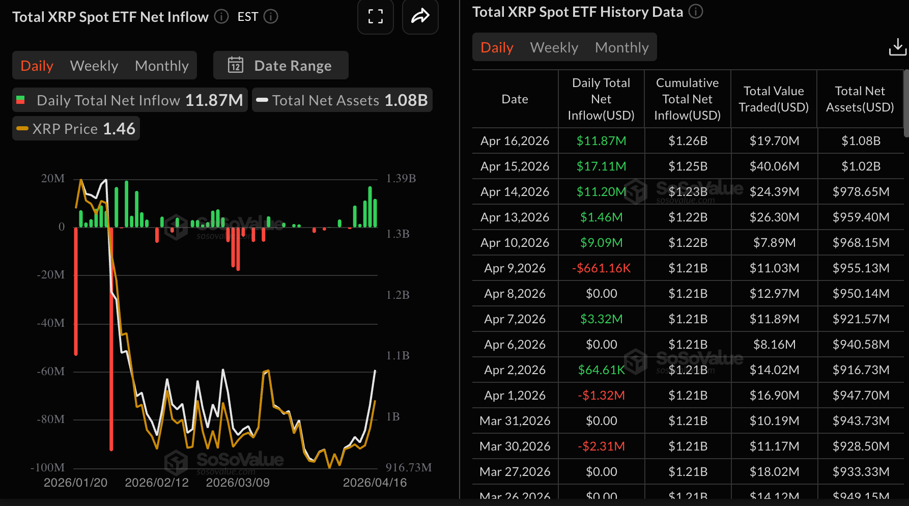 Тем временем спрос на спотовые ETF на XRP продолжает тесно следовать за биткоином и Ethereum, что подтверждается притоками в размере $11,87 млн в четверг. Совокупные притоки составляют $1,26 млрд, а активы под управлением — $1,08 млрд, что подчеркивает растущий интерес к XRP и связанным инвестиционным продуктам.