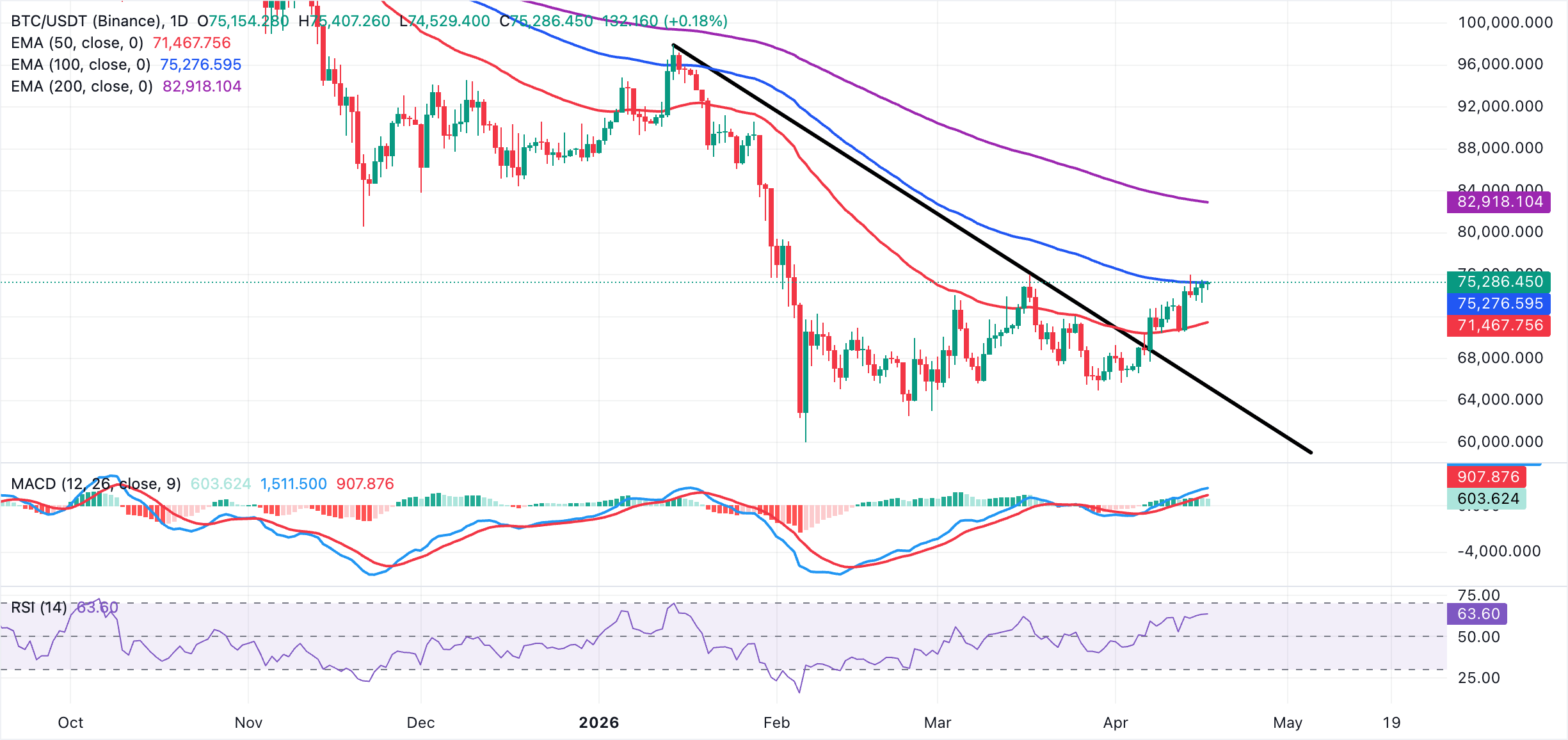 Биткоин торгуется на уровне $75 286, удерживая конструктивный бычий настрой, находясь немного выше 100-дневной экспоненциальной скользящей средней (EMA) на уровне $75 277 и значительно выше 50-дневной EMA на уровне $71 468. Такая конфигурация указывает на то, что недавний рост поддерживается базовым спросом.