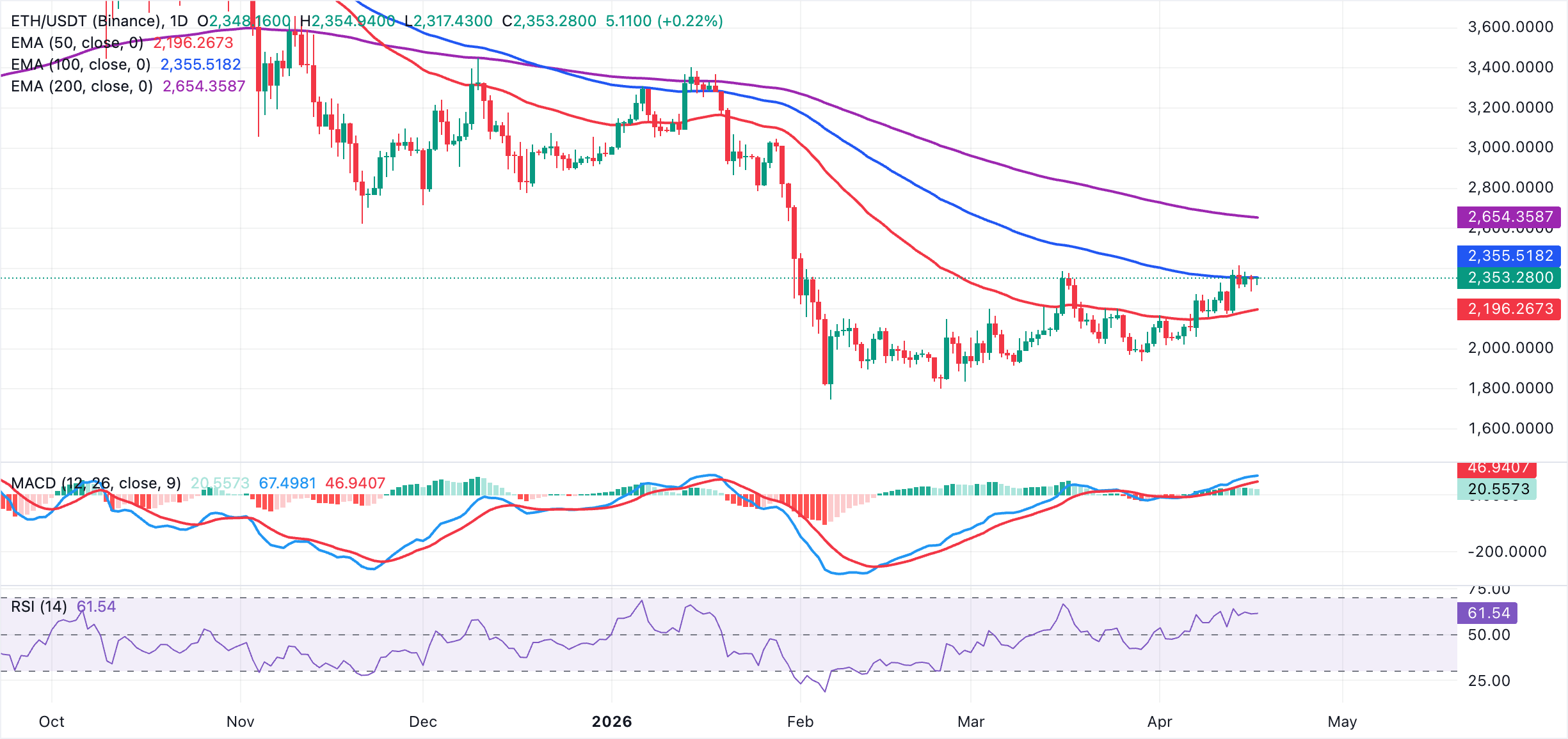 Ethereum торгуется на уровне $2 353, удерживаясь выше 50-дневной EMA на уровне $2 196. Тем не менее, рост токена смарт-контрактов ограничен ниже 100-дневной EMA на уровне $2 356 и 200-дневной EMA на уровне $2 654. Такая конфигурация указывает на нейтрально-слегка конструктивный настрой, при котором цена отвоевала краткосрочную поддержку тренда, в то время как более широкий нисходящий тренд остается в силе.