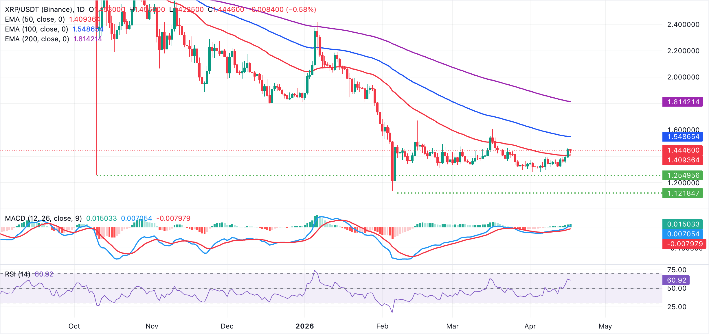 XRP, с другой стороны, торгуется на уровне $1,44, удерживаясь выше 50-дневной EMA на уровне $1,41. Однако его рост ограничен ниже 100-дневной EMA на уровне $1,55 и 200-дневной EMA на уровне $1,81, что сохраняет общий фон хрупким, несмотря на последний отскок. Импульс улучшился: гистограмма MACD на дневном графике стала положительной, а RSI колеблется около 61. Оба индикатора указывают на то, что покупатели пытаются восстановить давление в рамках общей структуры, которая по-прежнему доминируется сопротивлением скользящих средних сверху.