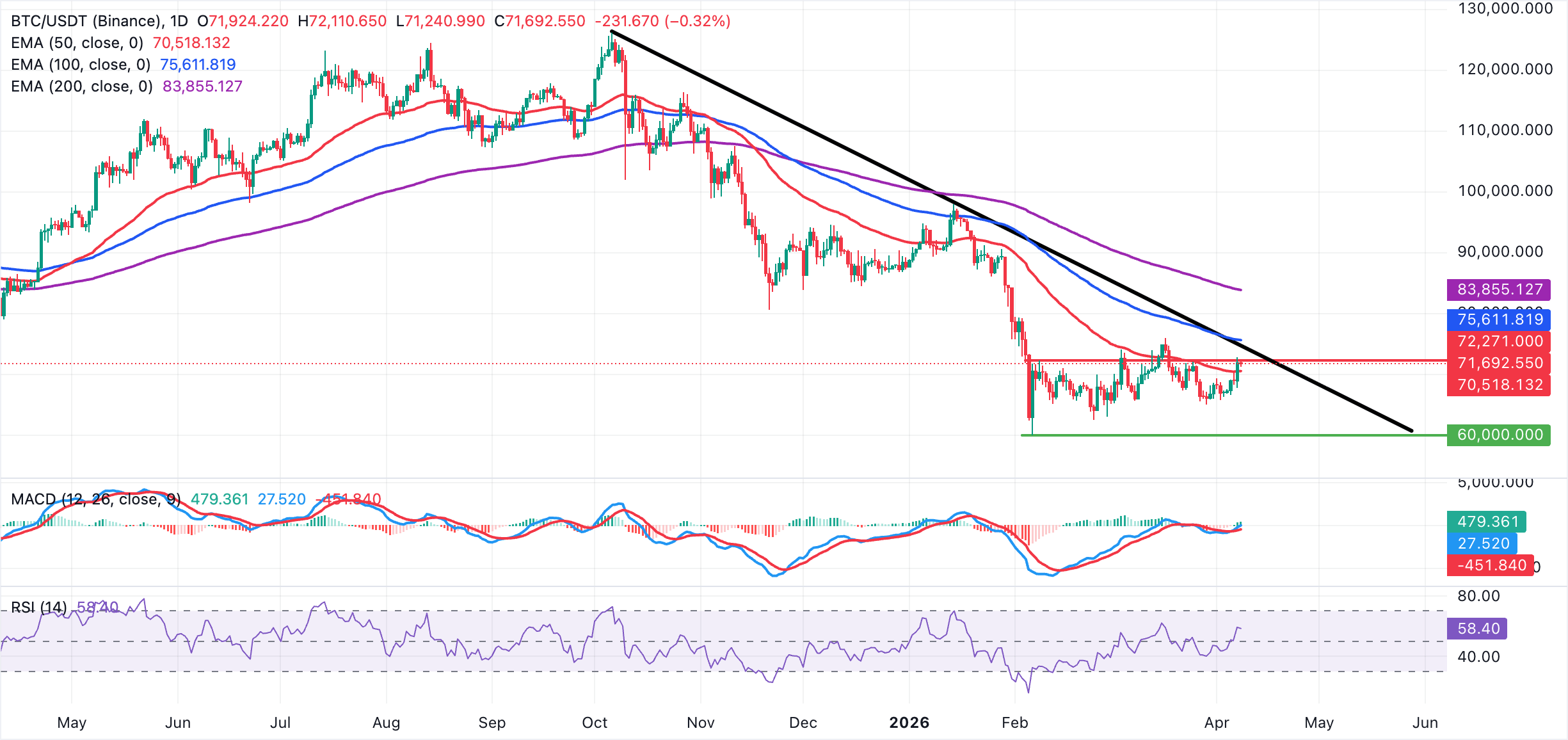 Первое сопротивление возникает на недавнем пиковом максимуме около $71 900, решительный прорыв которого откроет путь к горизонтальному барьеру на $72 271. Выше этих уровней внимание переключится на 100-дневную EMA на $75 612 и психологическую зону $76 000 как следующие цели роста.