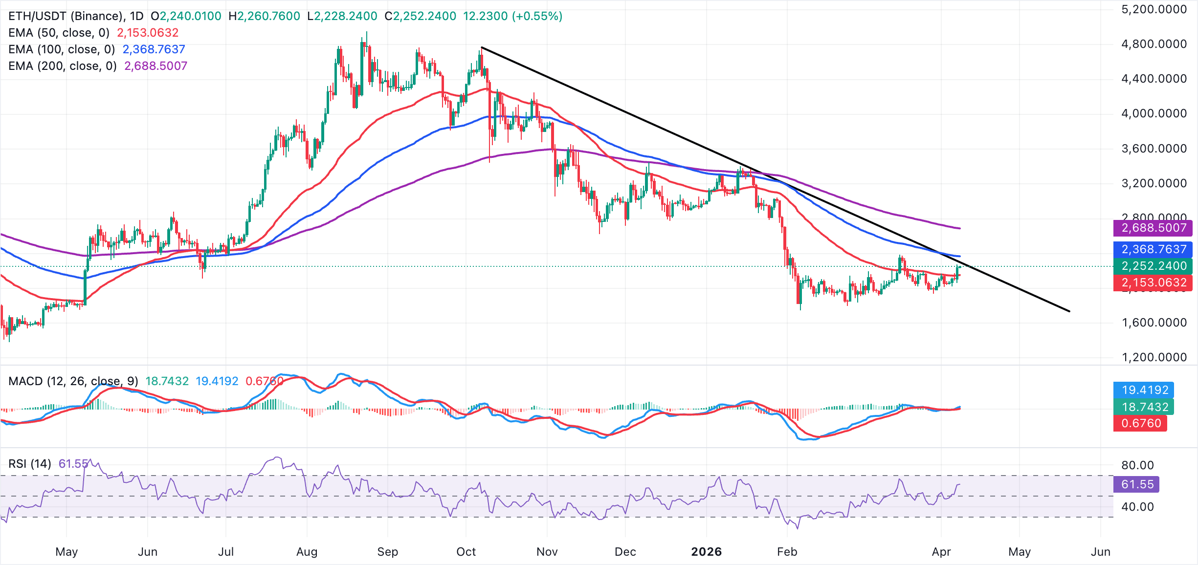 Ethereum торгуется выше $2 250 на момент написания в среду. Его краткосрочный уклон осторожно бычий после того, как цена отвоевала 50-дневную EMA около $2 150, при этом более широкие 100-дневная и 200-дневная скользящие средние остаются значительно выше и указывают на доминирующий долгосрочный нисходящий тренд.