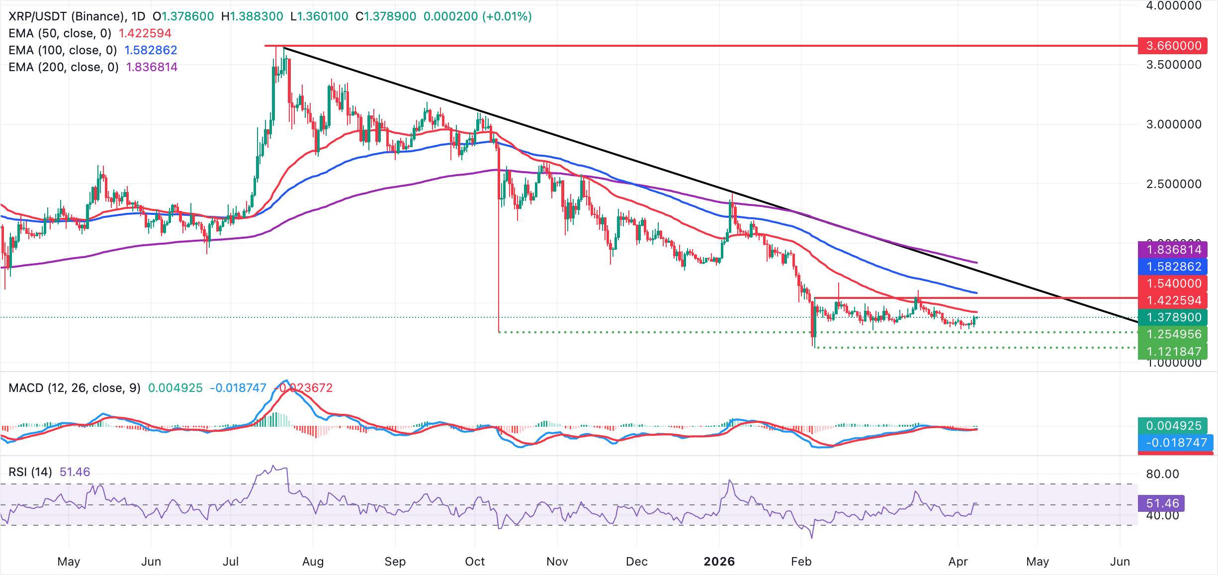 Что касается XRP, его краткосрочный уклон слегка медвежий, поскольку цена удерживается ниже нисходящей линии сопротивления и остается ограниченной под падающей 50-дневной EMA, которая сейчас находится чуть выше $1,40. 100-дневная и 200-дневная EMA расположены выше спота и имеют нисходящий наклон, формируя более широкий ход как коррекционную фазу в рамках долгосрочного нисходящего тренда.
