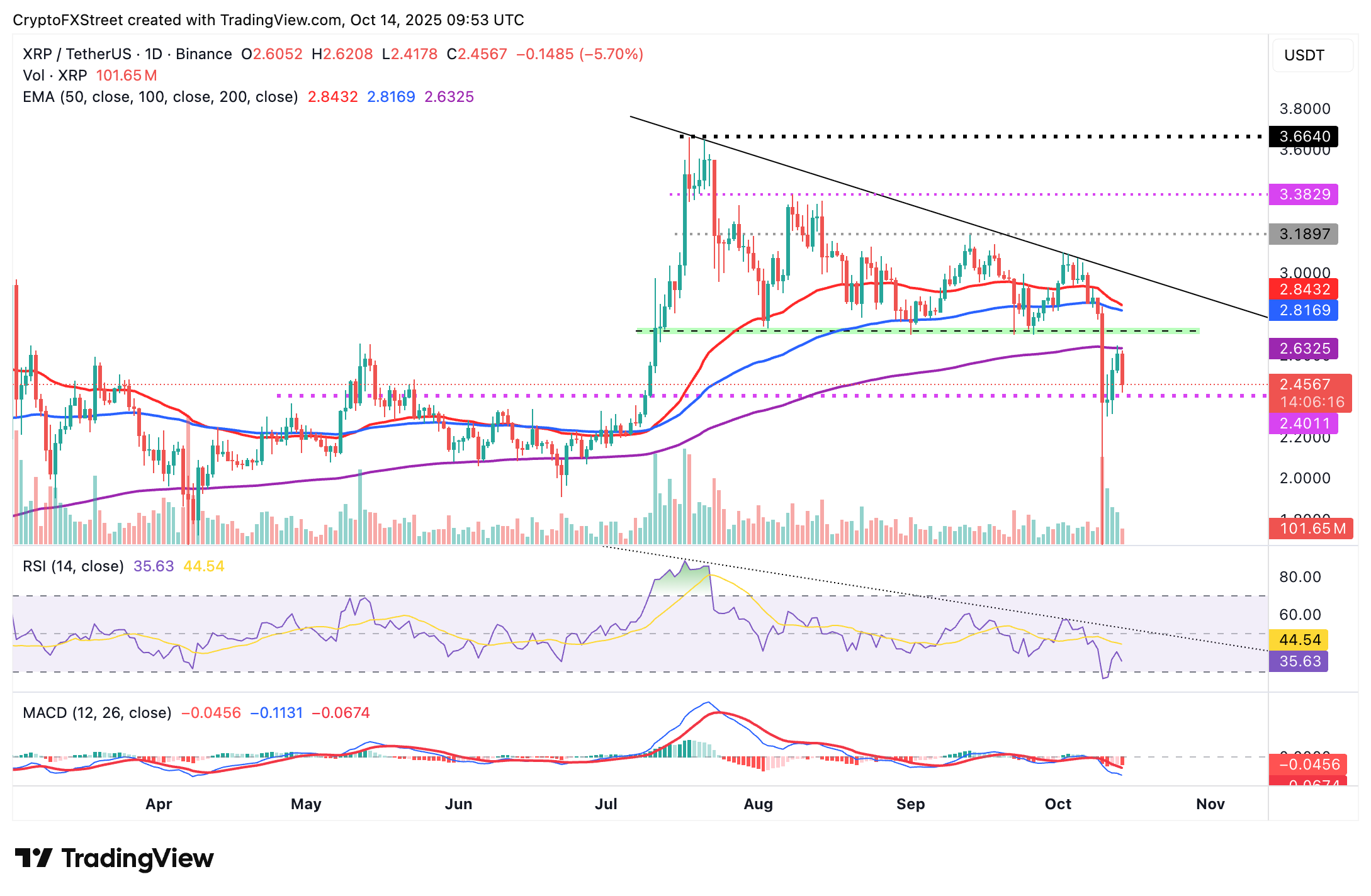 Что касается XRP, давление продаж прервало три последовательных дня восстановления, которые подтолкнули токен к тестированию сопротивления 200-дневной EMA на уровне $2,63 в понедельник. Токен для трансакций через границу торгуется выше $2,40 на момент написания, что является краткосрочным уровнем поддержки на дневном графике.