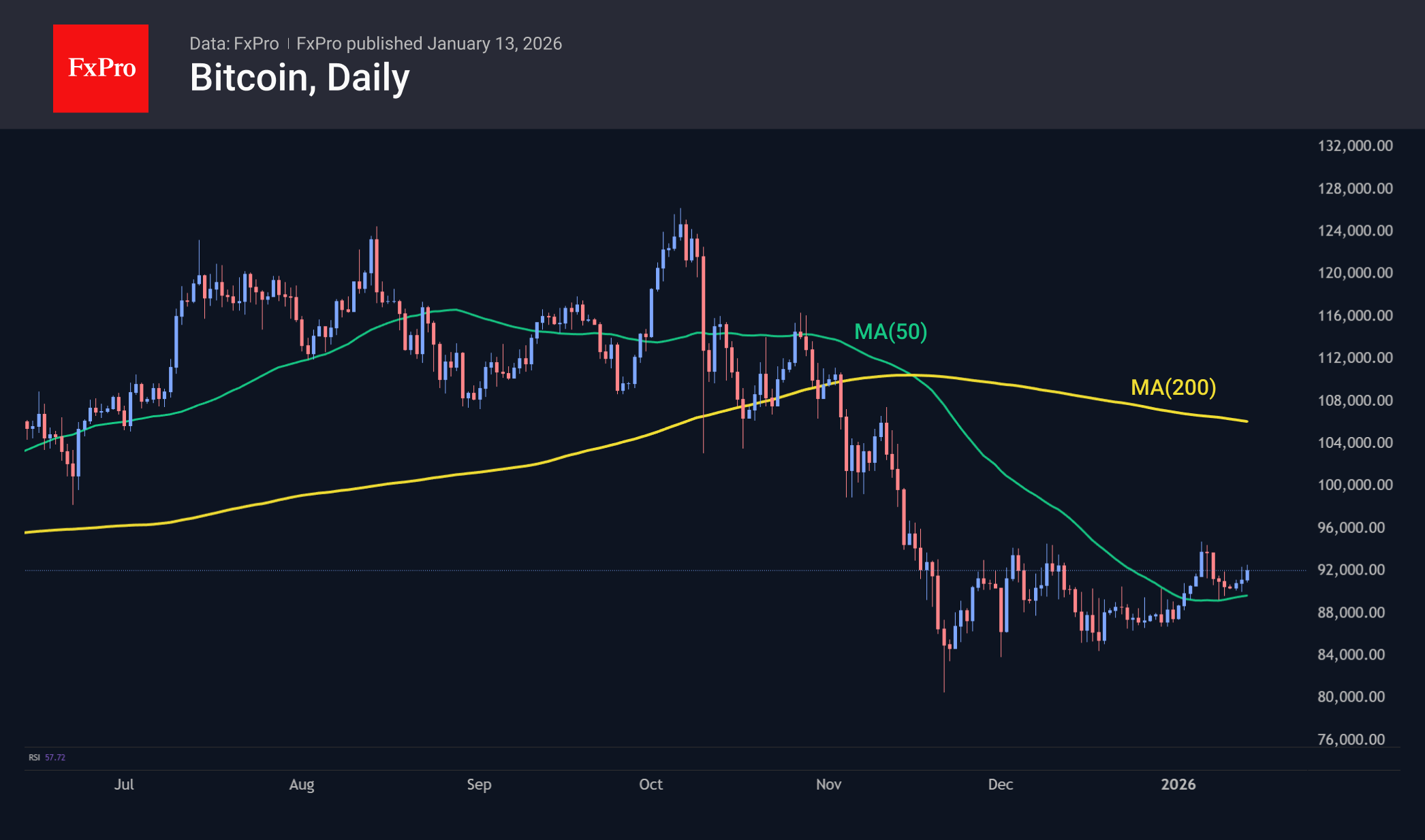 Биткоин превысил $92K с вечера понедельника пытаясь забраться выше уровней недельной давности. Внутри дня в понедельник были широкие колебания со внушительным увеличением продаж при выходе цены выше $92K, но это не заставило быков остановить попытки. Слишком опрометчиво будет делать выводы об устойчивом аппетите к риску пока цена остаётся ниже предыдущих локальных максимумов у $95K. Оптимистичный взгляд на ситуацию рассматривает серию повышающихся локальных минимумов с ноября.