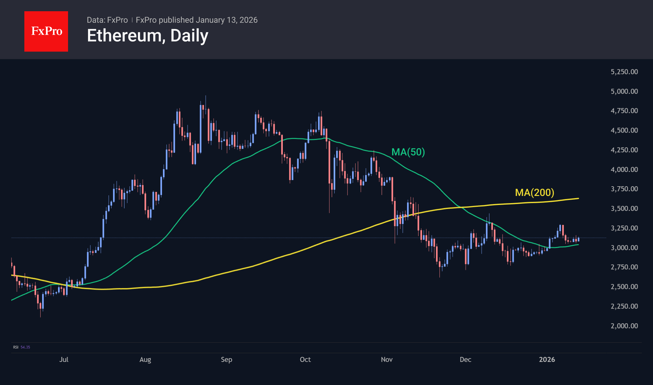 Ethereum удерживается выше $3000, аккуратно формируя дно у этой отметки последние пять дней. В конце прошлого месяца аналогичный уровень поддержки был вблизи $2920. Как и в случае с Биткоином, ETH торгуется выше 50-дневной MA, но всё ещё ниже локального пика 6 января.