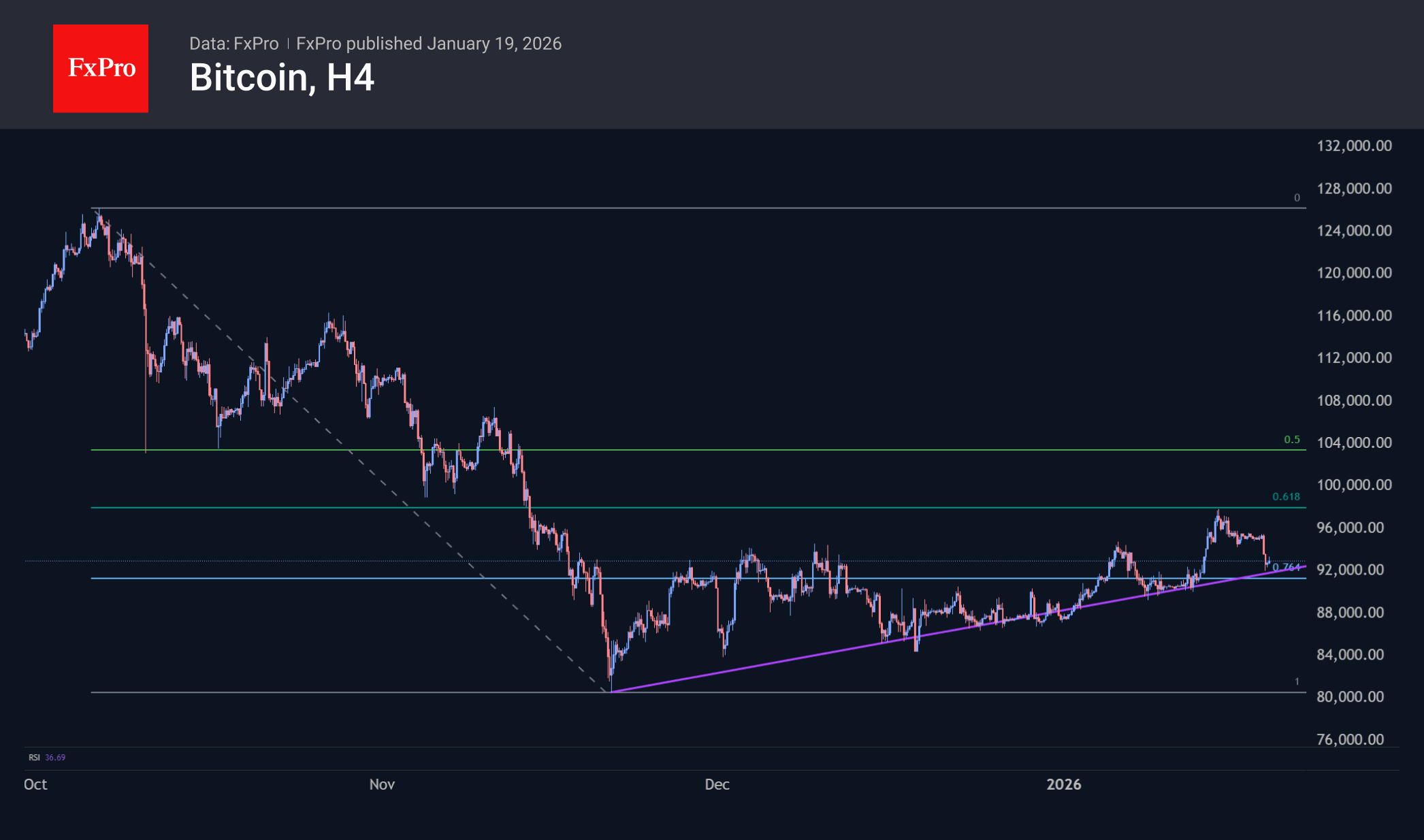 Биткоин нырнул на 3.8% вскоре после открытия торгов в Азии, сократив потери до 2.5% на торгах в Европе. Медведи продвигают свою повестку, формируя мощные импульсы снижения во время наиболее низкой ликвидности. Это позволяет формировать пугающие свечи на графиках и срывать стоп-ордера. Технически первая криптовалюта остаётся в рамках отскока после распродажи октября-ноября. При этом импульс снижения не сломил тенденцию к росту, проходящую через минимумы ноября и декабря прошлого года.