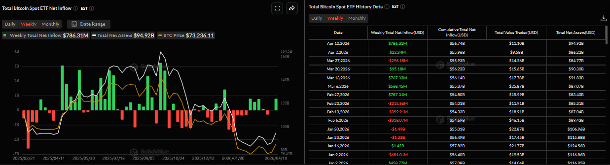 Институциональный спрос на биткоин поддержал его цену на прошлой неделе. Данные SoSoValue показывают, что спотовые биткоин-ETF зафиксировали приток в размере $786,31 млн на прошлой неделе после умеренного притока на предыдущей неделе. Если эти притоки продолжатся и усилятся на этой неделе, BTC может показать рост.