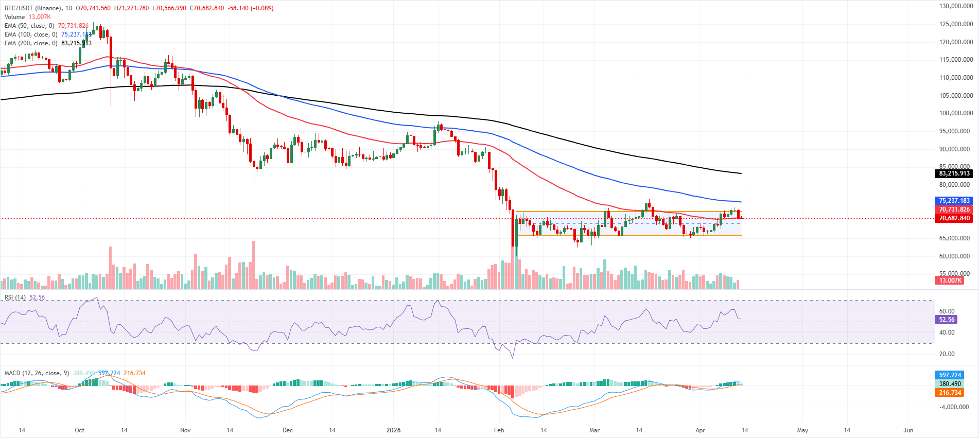 На дневном графике BTC сохраняет ограниченный краткосрочный тон, так как цена удерживается под плотным слоем сопротивления экспоненциальных скользящих средних. Цена колеблется около 50-дневной EMA на уровне $70 731, оставаясь ниже 100-дневной EMA около $75 237 и 200-дневной EMA около $83 216, что усиливает более широкую медвежью структуру.