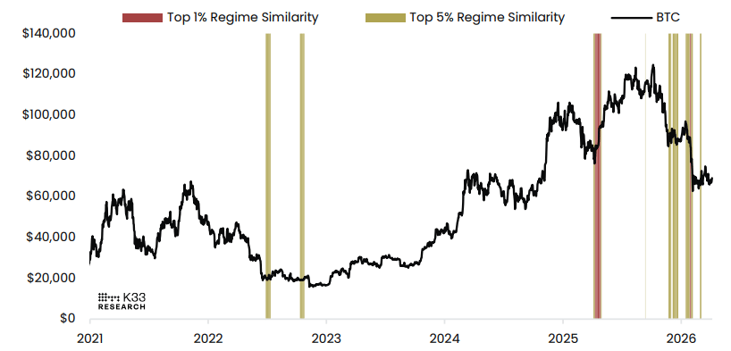 Аналитик продолжил: «Недавние режимы естественно ближе всего напоминают текущий, поскольку сходство режимов обычно сохраняется длительное время. Рассматривая топ-5% совпадений режимов вне 2026 года, наиболее близкое сходство обнаружено в медленном, постепенном медвежьем консолидационном рынке между июлем и сентябрем 2022 года».