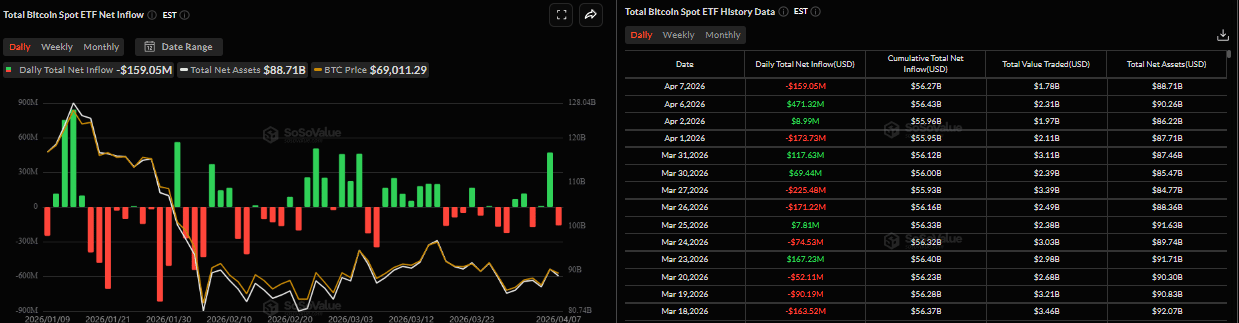 Институциональный спрос остается смешанным на этой неделе. Данные SoSoValue показывают, что спотовые биткоин-ETF зафиксировали отток в размере $159,05 млн во вторник после притока в $471,32 млн в понедельник. Поскольку перемирие между США и Ираном было объявлено в начале азиатской сессии — когда рынки США были закрыты — спотовые биткоин-ETF могут увидеть положительные притоки после открытия Уолл-стрит позже в течение дня, что потенциально обеспечит дополнительную поддержку продолжающемуся восстановлению биткоина.