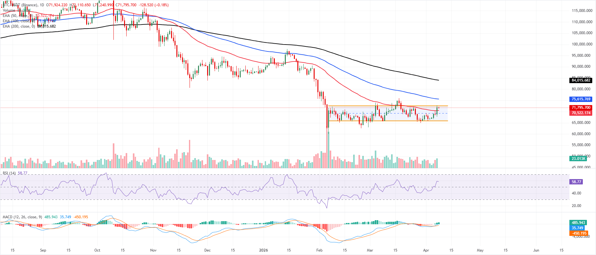 Биткоин (BTC) приближается к верхней границе горизонтального канала, который ограничивает цену с начала февраля, торгуясь около $71 800 в среду, и прорыв этой зоны может свидетельствовать о движении вверх. Снижение геополитической напряженности между США и Ираном после объявления о двухнедельном перемирии поддерживает бычий настрой для Криптокороля, намекая на возможный прорыв вперед.