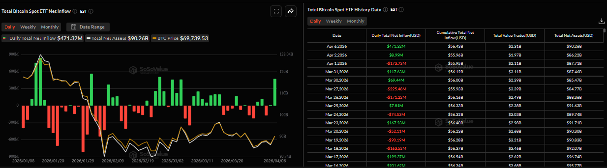 Институциональный спрос начал неделю на позитивной ноте. Данные SoSoValue показывают, что спотовые биткоин-ETF зафиксировали приток в размере $471,32 млн в понедельник, что является самым высоким однодневным притоком с 25 февраля. Если этот институциональный спрос продолжится и усилится, цена BTC может восстановиться.