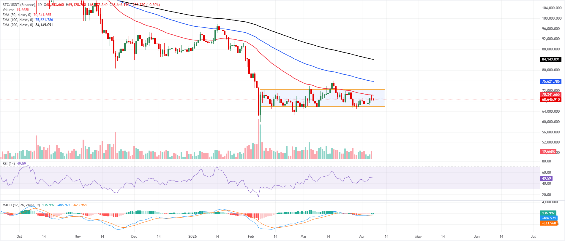 Во вторник биткоин торгуется ниже $69 000 после отскока от 50-дневной экспоненциальной скользящей средней (EMA) на уровне $70 341 накануне. BTC удерживается в нижней половине параллельного канала, сохраняя краткосрочный умеренно медвежий уклон несмотря на последнее стабилизирование.