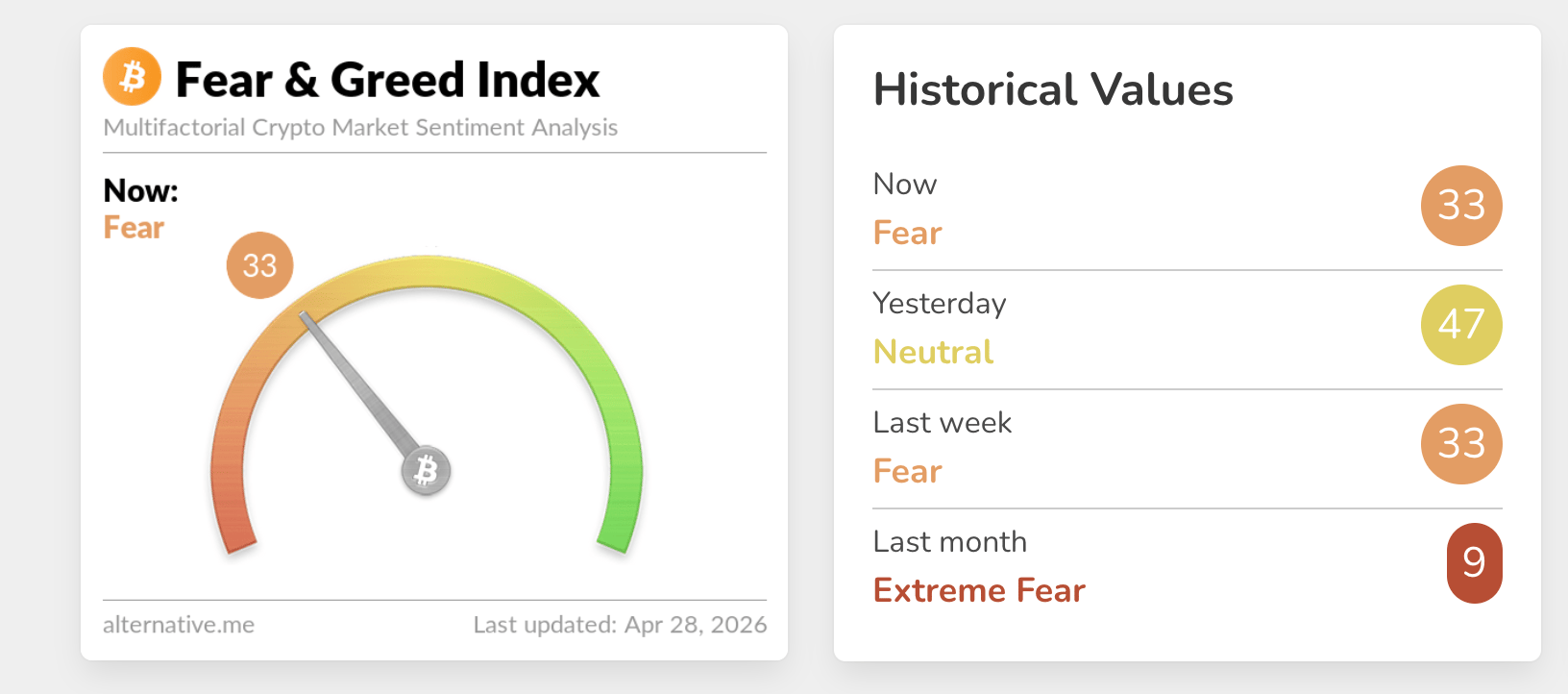 Конфликт на Ближнем Востоке продолжает держать инвесторов в напряжении, в то время как индекс страха и жадности криптовалют (Crypto Fear & Greed Index) во вторник снизился до 33 с 47 накануне. Несмотря на соблюдение перемирия между США и Ираном, пролив Ормуз остается закрытым.