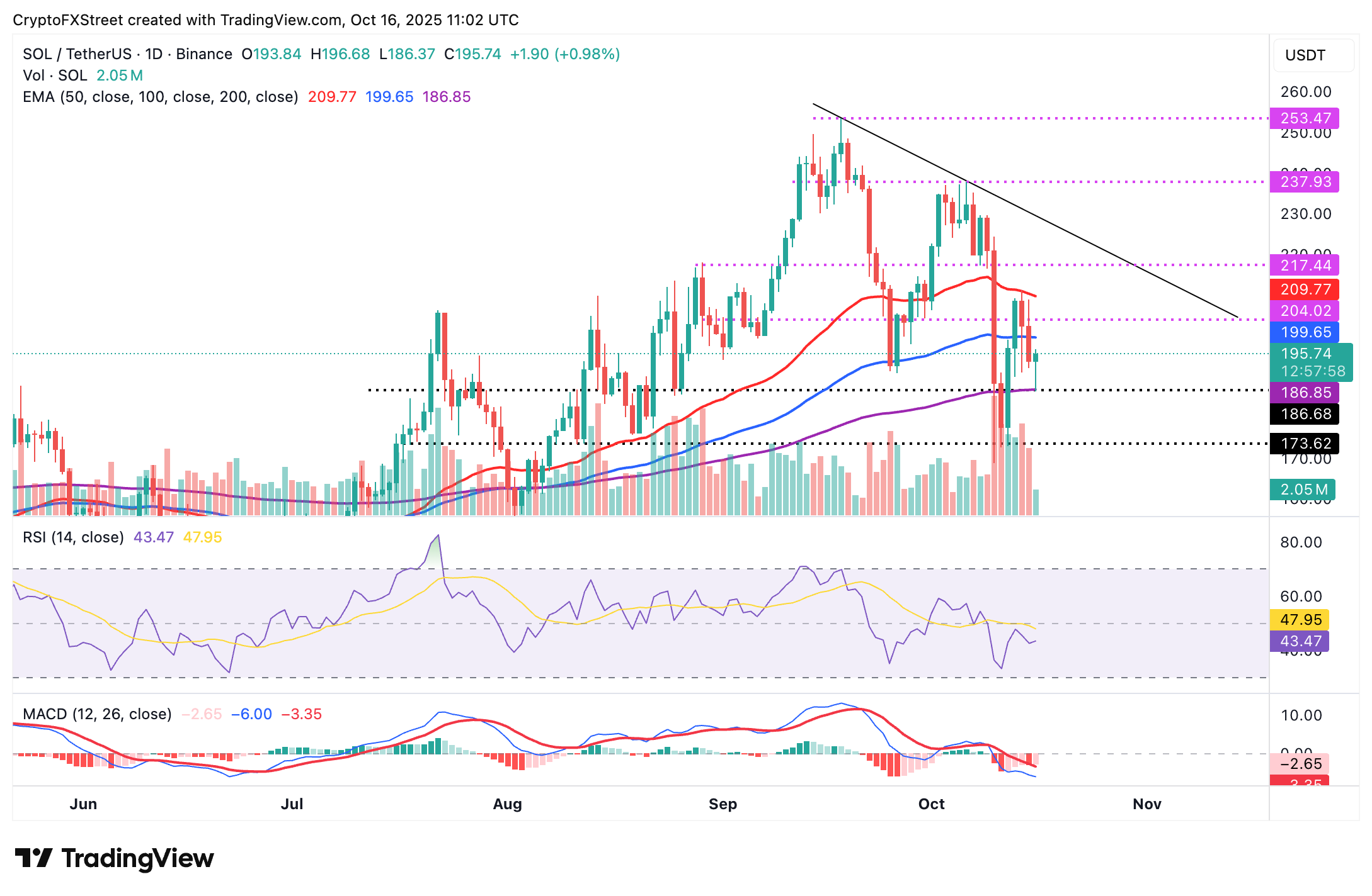 Цена Solana удерживается между двумя ключевыми уровнями: 200-дневной экспоненциальной скользящей средней (EMA), обеспечивающей поддержку на уровне $186, и 100-дневной EMA, которая выделяет сопротивление на уровне $199.