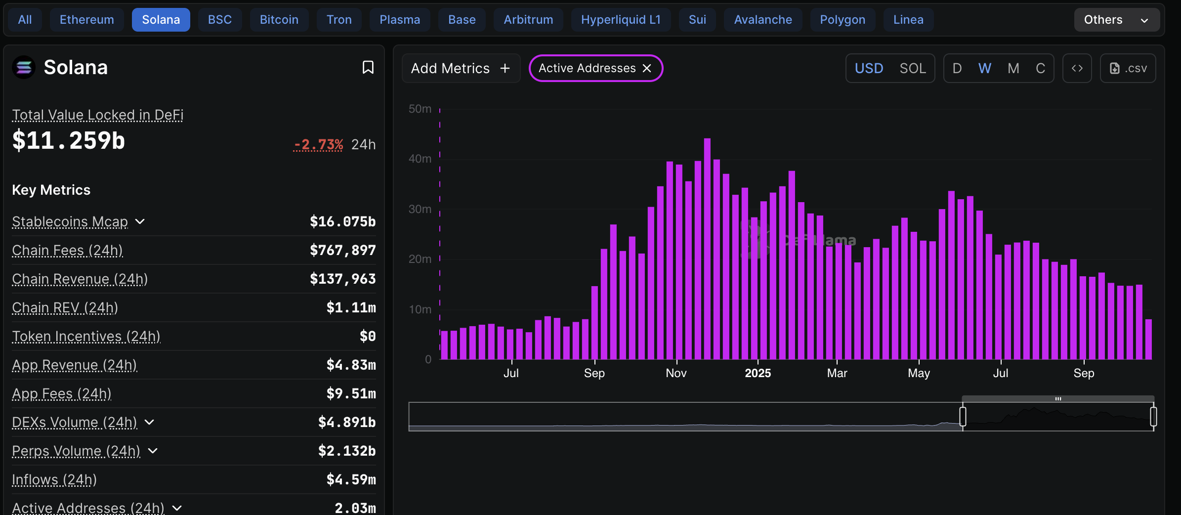 Тем не менее, DefiLlama привлекает внимание инвесторов к значительному снижению числа адресов, активно совершающих транзакции в блокчейне Solana. На приведенном ниже графике видно, что активные адреса составляют 8,04 миллиона за неделю с 13 по 19 октября, что является заметным снижением по сравнению с 33,63 миллиона, зафиксированными с 19 по 25 мая.