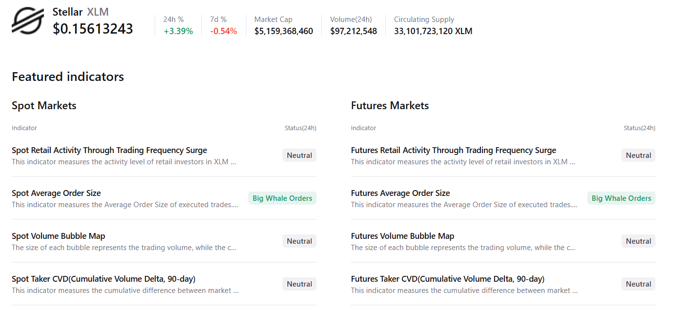 Аналогично для XLM, спотовые и фьючерсные рынки демонстрируют крупные ордера китов при в основном нейтральных условиях по другим метрикам, что предполагает бычий прогноз.