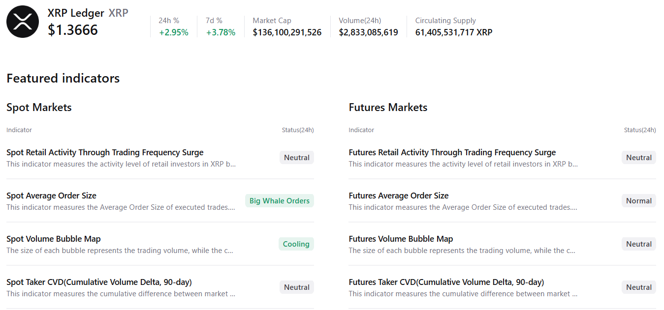 Спотовые рынки XRP показывают крупные ордера китов и охлаждение условий, при этом большинство других показателей нейтральны, что указывает на потенциальное движение вверх.
