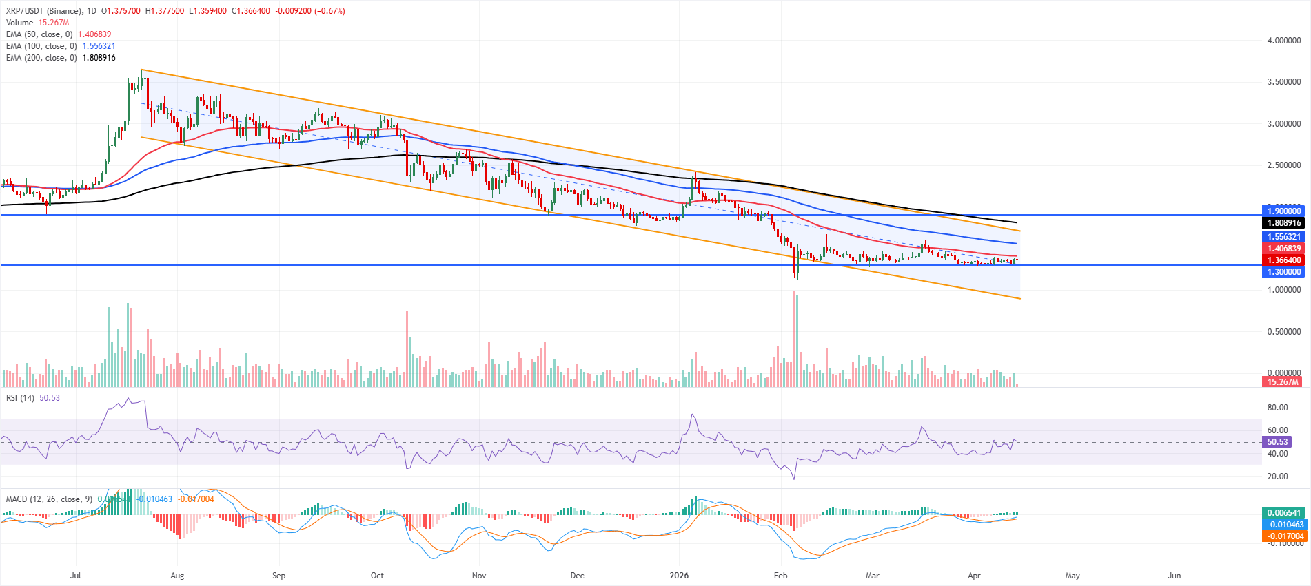 Цена XRP торгуется на уровне $1,36 во вторник после отскока почти на 4% накануне. XRP сохраняет сдержанный тон, удерживаясь в более широком нисходящем параллельном канале и ниже 50-дневных, 100-дневных и 200-дневных экспоненциальных скользящих средних (EMA).