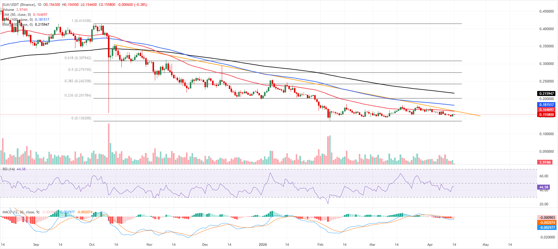 Снизу ключевая структурная поддержка находится около якоря Фибоначчи на уровне $0,136, где ожидается защита более широкой базы, если продажи возобновятся.