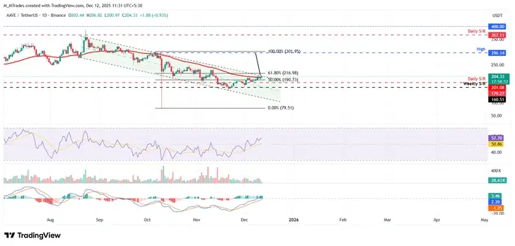 Цена Aave (AAVE) торгуется выше $204 на момент написания в пятницу и приближается к верхней границе своего нисходящего параллельного канала; прорыв из этой структуры будет благоприятен для быков. Более того, данные по цепочке и деривативам также поддерживают бычье настроение, в то время как техническая цель модели предполагает ралли выше $296.