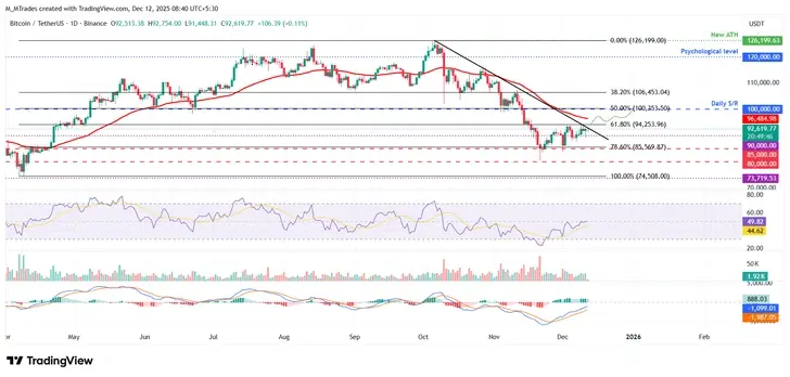 Цена биткойна была отвергнута на уровне 61,8% коррекции Фибоначчи на $94,253 (построенной от минимума апреля $74,508 до исторического максимума $126,199, установленного в октябре) в среду и немного снизилась в тот день. Однако в четверг BTC отскочил после повторного тестирования своего психологического уровня $90,000. На момент написания в пятницу BTC колебался около $92,000.