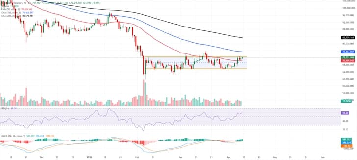 Биткоин торгуется на уровне $72 200 в пятницу, сохраняя нейтральный до слегка конструктивного настрой, находясь выше 50-дневной экспоненциальной скользящей средней (EMA) на уровне $70 609, но оставаясь ограниченным внутри параллельного канала. Верхняя граница этого канала расположена чуть выше, около $72 600, выступая в качестве немедленного сопротивления и сдерживая быков ниже EMA с более высоким таймфреймом – 100-дневной и 200-дневной на уровнях $75 463 и $83 379 соответственно.
