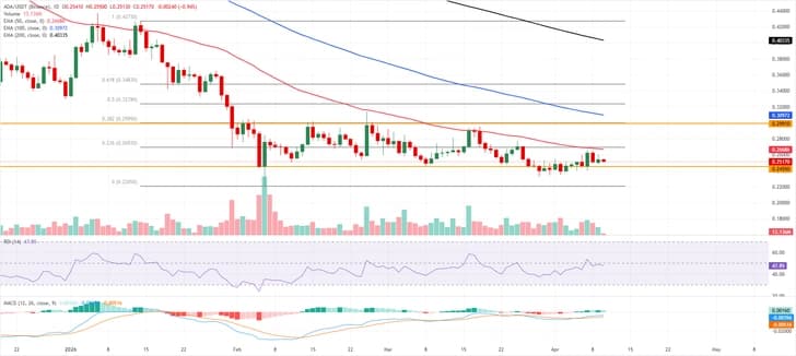 Цена Cardano (ADA) опускается ниже $0,26 в пятницу после отскока от ключевой зоны сопротивления ранее на этой неделе. Смешанные сигналы с рынка деривативов в сочетании с ослаблением индикаторов импульса указывают на снижение бычьего импульса, оставляя ADA подверженной потенциальной краткосрочной коррекции.