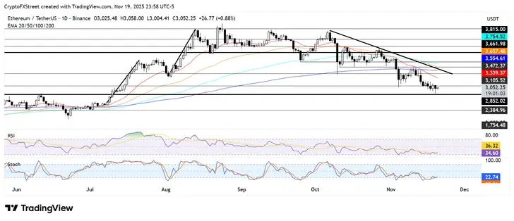 Прогноз по Ethereum: ETH может установить поддержку на уровне $2 800 на фоне продаж китов и ETF