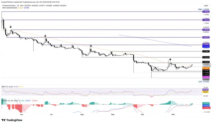 Pi Network (PI) вырос на 11% на этой неделе, поддерживаемый своей белой книгой по регулированию рынка криптоактивов (MiCA) для рынков Европейского Союза (ЕС). Технический прогноз остается бычьим, так как PI превышает давнее динамическое сопротивление, 50-дневную экспоненциальную скользящую среднюю, готовясь к прорывному ралли.