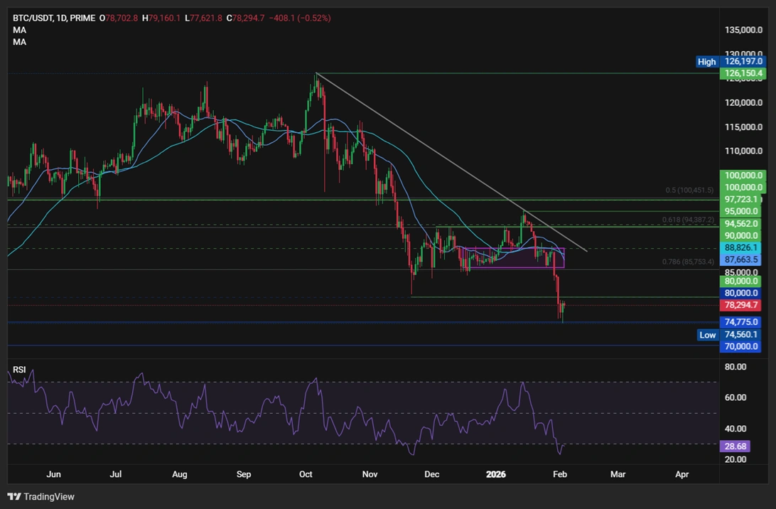 Биткойн отскочил от вчерашнего минимума в 74,5 тыс., торгуясь более чем на 4% выше, около 78 тыс. на момент написания. Восстановление происходит на фоне улучшения настроений в отношении риска после отскока драгоценных металлов и более сильных, чем ожидалось, прибылей от компаний, сосредоточенных на ИИ. Накопление по стратегии наряду с возобновившимися притоками в ETF также способствовало росту цен.