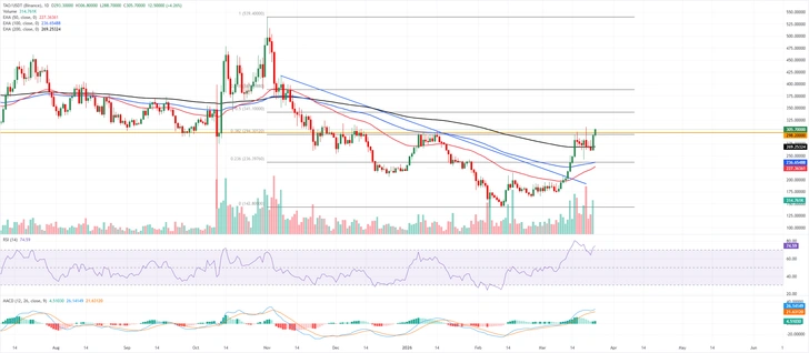 Цена Bittensor продолжает расти, торгуясь выше $305,50 во вторник. Краткосрочный настрой осторожно бычий, поскольку цена пробивает уровни 50-дневной, 100-дневной и 200-дневной экспоненциальных скользящих средних, подтверждая фазу восстановления от минимума в $140 в рамках более широкой структуры Фибоначчи, измеряемой от $539,40 до $142,80.