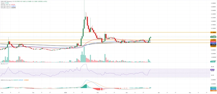 Цена DUSK (DUSK) продолжает расти, торгуясь выше $0,110 во вторник, наращивая трехдневную серию побед на фоне усиления бычьих настроений на крипторынке. Улучшение настроений, отраженное в ончейн-данных и данных по деривативам, поддерживает позитивный прогноз, в то время как технический анализ намекает на дальнейший рост с целью $0,138 для DUSK.