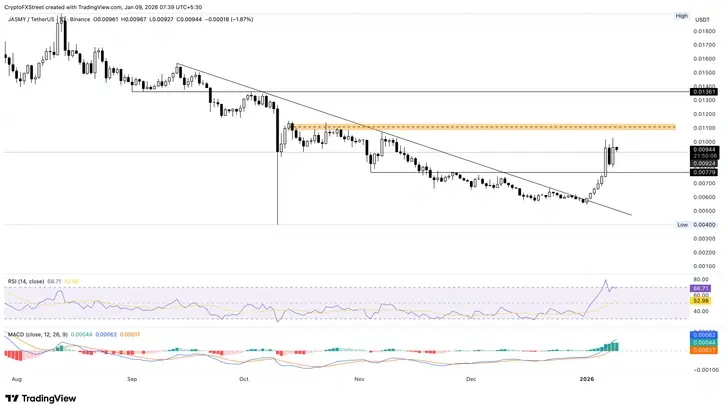 JasmyCoin снизился почти на 2% на момент публикации в пятницу после почти 15%-ного скачка накануне. Мемная монета испытывает трудности с восстановлением психологического уровня $0,01000, который сдерживает цену с начала ноября. Если JASMY превысит этот уровень, он может нацелиться на область офферов $0,01100, последний раз протестированную 29 октября.