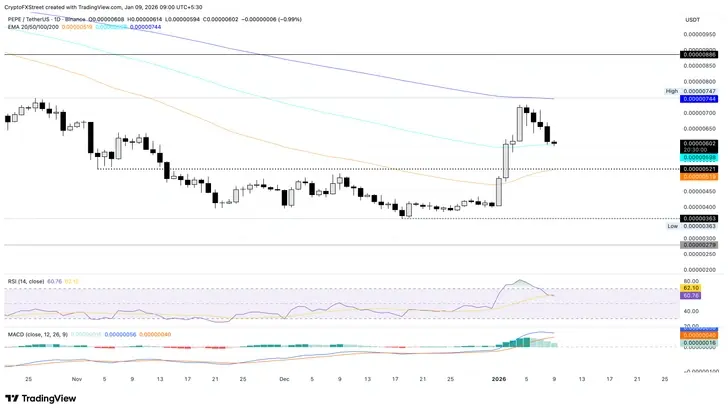 Pepe (PEPE) находится под сильным давлением продаж, торгуясь в красной зоне пятый день подряд, снизившись на 1% на момент публикации в пятницу. Падение Pepe после роста на 72% на прошлой неделе указывает на вероятную фазу фиксации прибыли, в то время как ончейн-данные свидетельствуют о снижении активности в сети. Технический прогноз для PEPE сосредоточен на 100-дневной экспоненциальной скользящей средней (EMA) как ключевом уровне поддержки.