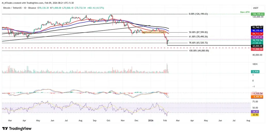 Цена биткоина упала почти на 10% на прошлой неделе, достигнув минимума в $60 000 в пятницу, и отскочила, протестировав дневное сопротивление на уровне $73 072 в воскресенье. На момент написания в понедельник BTC торгуется на уровне $70 700. Если BTC продолжит восстановление, он может продлить рост к дневному сопротивлению на уровне $73 072. Индекс относительной силы (RSI) на дневном графике составляет 34, направляясь вверх после отскока из зоны перепроданности на прошлой неделе, что указывает на ослабление медвежьей силы и намекает на восстановление. Тем не менее, трейдерам следует оставаться осторожными, так как индикатор схождения/расхождения скользящих средних (MACD) показал медвежье пересечение, указывая на продолжение нисходящего тренда.