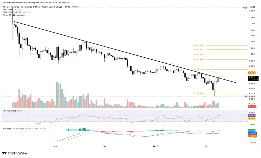 Aster вырос на 11% в воскресенье, закрывшись выше долгосрочной линии сопротивления, соединяющей максимумы 7 октября и 19 ноября. На момент написания ASTER удерживается выше $0,600 в понедельник, ниже снижающейся 50-дневной экспоненциальной скользящей средней на уровне $0,683, что ограничивает краткосрочный настрой. Технические индикаторы на дневном графике указывают на повышенную вероятность возобновления бычьего импульса в ASTER, подтверждая теорию прорыва. Индикатор схождения/расхождения скользящих средних (MACD) пересек сигнальную линию в субботу, начиная положительную волну последовательно растущих гистограмм MACD.