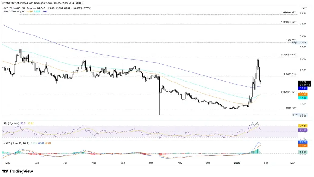 Axie Infinity торгуется ниже $2 на момент публикации в понедельник, зафиксировав почти 4% потерь за день. Игровой токен фиксирует свои третьи подряд дни убытков, продлевая 22% снижение с воскресенья. AXS приближается к 200-дневной EMA на уровне $1,79 как ближайшей поддержке после пробоя уровня 50% коррекции на уровне $2,23, измеренного от максимума 14 мая на уровне $3,70 до минимума 17 декабря на уровне $0,75.
