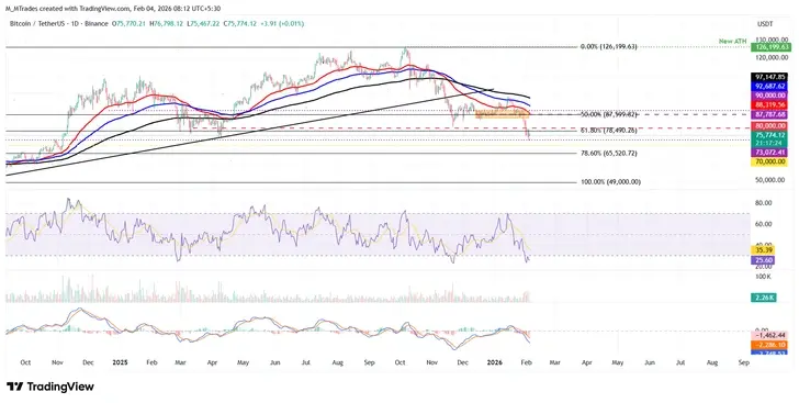 Цена биткоина закрылась ниже уровня 61,8% коррекции Фибоначчи (от минимума августа 2024 года $49 000 до исторического максимума октября 2025 года $126 199) на уровне $78 490 в воскресенье. Она скорректировалась почти на 4%, достигнув минимума $72 945 во вторник (уровень, не наблюдавшийся с начала ноября 2024 года). На момент написания в среду BTC торгуется на уровне $75 700. Если BTC возобновит свое нисходящее движение и закроется ниже дневной поддержки на уровне $73 072 на дневном графике, это может привести к дальнейшему снижению к ключевому психологическому уровню $70 000.