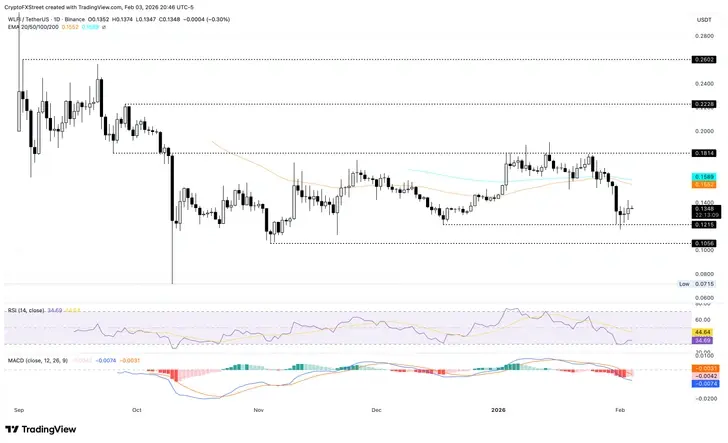 World Liberty Financial торгуется выше $0,1300 на момент публикации в среду, удерживая прирост на 3% по сравнению с предыдущим днем. Тренд остается уязвимым, так как WLFI находится ниже 50-дневной экспоненциальной скользящей средней (EMA) на уровне $0,1552, а 200-дневная EMA на уровне $0,1589 закрепляет более широкий нисходящий тренд. Устойчивое восстановление WLFI может столкнуться с сопротивлением со стороны этих скользящих средних.