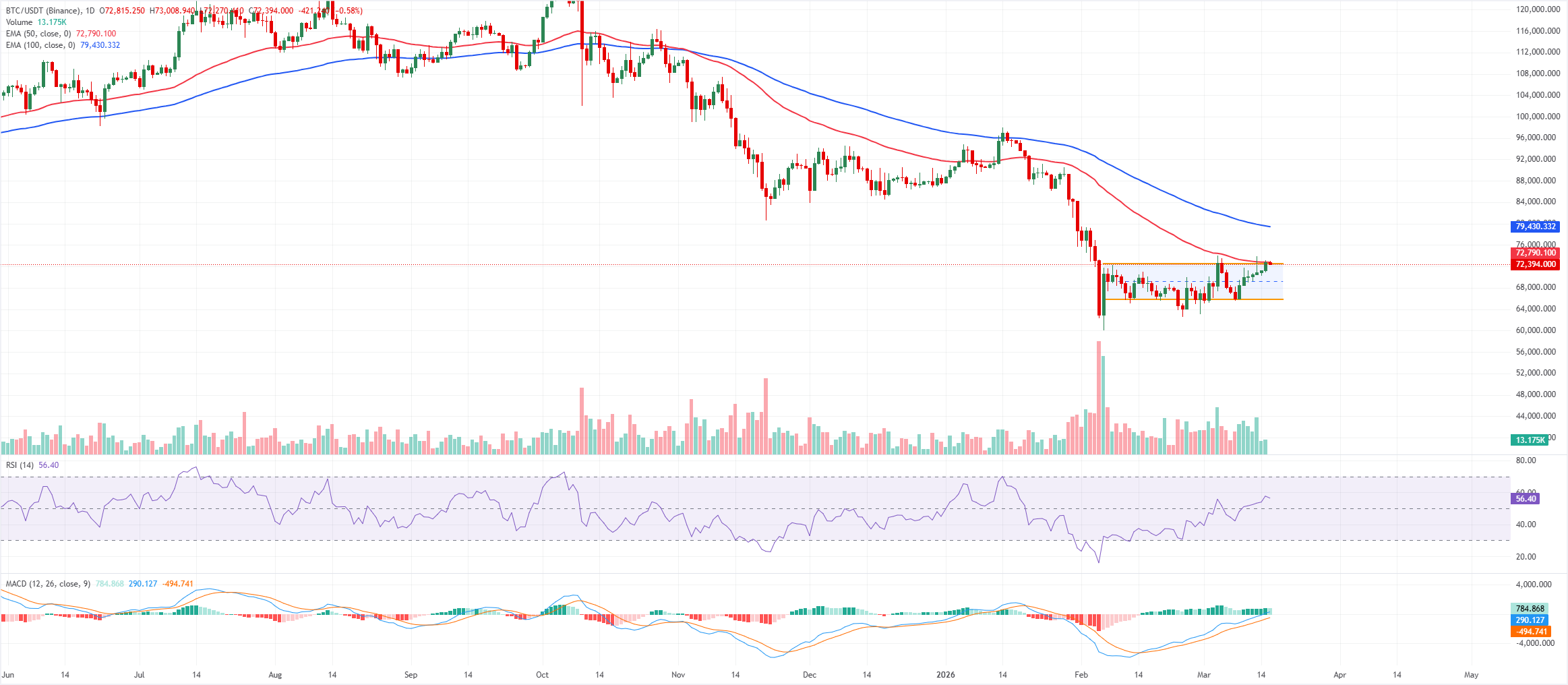 Цена биткоина торгуется на уровне $72 300 в понедельник. Краткосрочный настрой является слабым бычьим, так как цена нажимает на верхнюю границу параллельного канала который формировал понижающиеся максимумы с начала февраля. Ежедневные закрытия остаются значительно ниже 50-дневной и 100-дневной экспоненциальных скользящих средних (EMA), которые все еще находятся в верхних 70 000 и средних 80 000, действуя как более широкое динамическое сопротивление.
