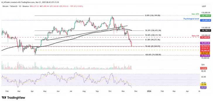 Биткойн начал неделю с медвежьей ноты, продлив свое снижение на 2% и закрывшись ниже уровня Фибоначчи 61,8% на отметке $94 253 (проведенный от минимума 7 апреля $74 508 до исторического максимума $126 299, установленного 6 октября). Тем не менее, BTC нашел поддержку на психологическом уровне $90 000 и консолидировался там в течение следующих двух дней. В четверг BTC продолжил свою коррекцию, упав более чем на 5% и опустившись ниже $90 000, закрыв день на уровне $86 637. На момент написания в пятницу BTC торгуется около $85 900.